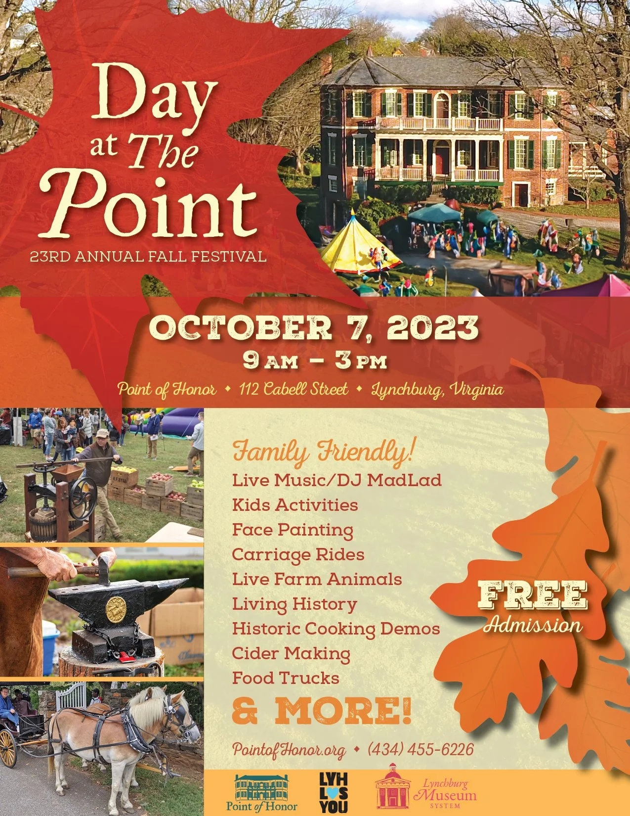Day at The Point is an annual, family friendly, fall festival held at Point of Honor in Lynchburg, Virginia. The historic grounds of Point of Honor come to life with living history, live music, food, and local vendors. Festival goers can experience period craft demonstrations, house tours, and costumed interpreters. Special 15% discount in Gift Shop.